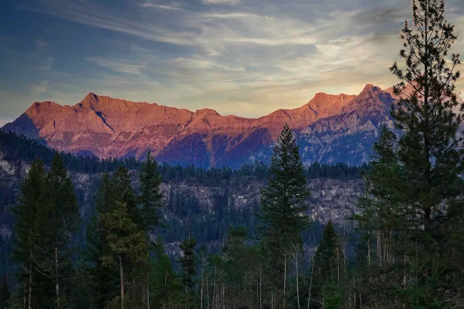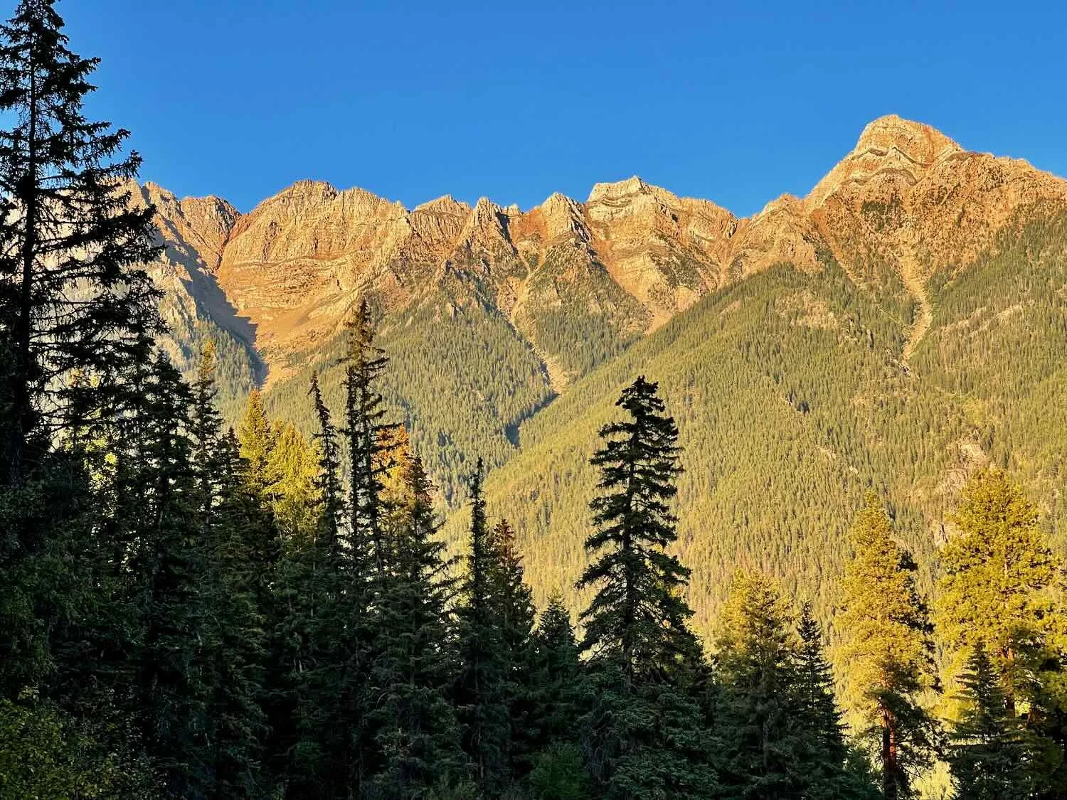 The last rays of sun striking the peaks of the Kootney Range, east of our wild camp. Kootenay River Valley, British Columbia, Canada. Copyright © 2019-2022 Pedals and Puffins.