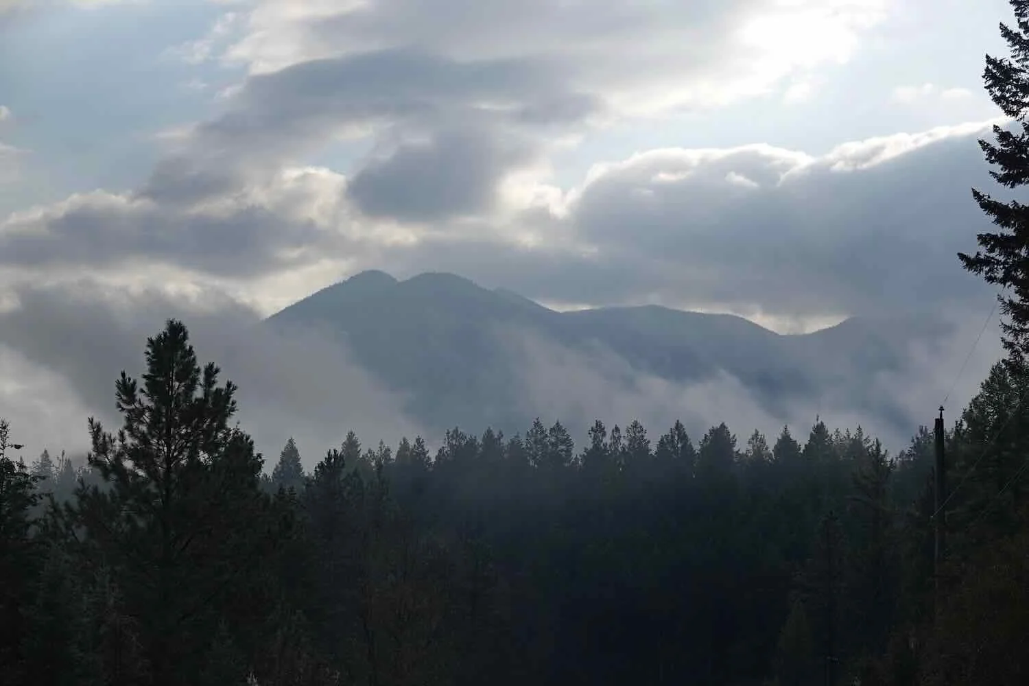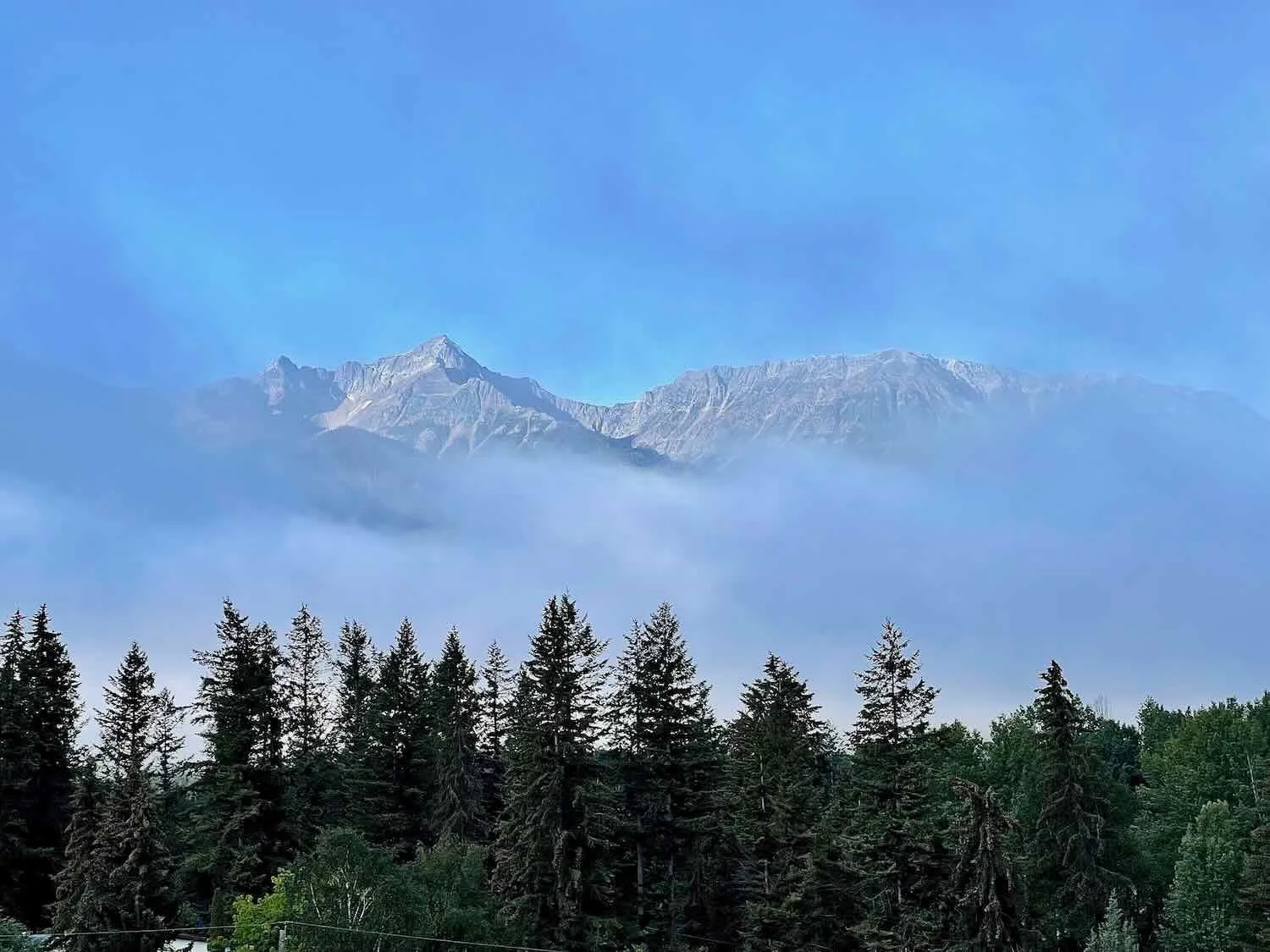 Peaks of the Dogtooth Range pierce the veil of fog that lies over the Rocky Mountain Trench. Columbia River Valley, British Columbia, Canada. Copyright © 2019-2022 Pedals and Puffins.