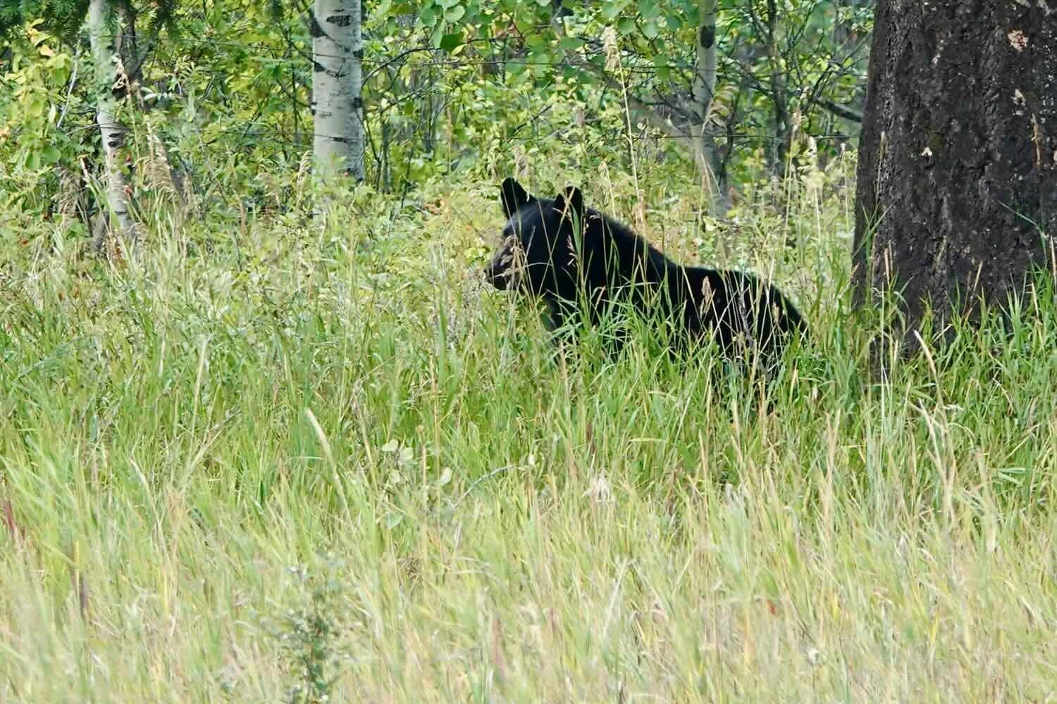 Although there were quite a few homesteads along the highway, much of the surrounding landscape remained in a relatively natural state. The names of many landmarks, roads and businesses included the word ‘bear’, hinting that we were still very much in bear country. And we were not disappointed. As we cycled past a field of tall hay, we were startled by the sudden sound of a large animal bounding out of a ditch beside the road. We stopped to see a black bear dashing across the field away from us. It seemed quite unnerved by the sight of two cyclists, and it didn’t stop running until it reached the relative safety of the trees on the far side of the field, about 100 yards (100 m) away. Then it stopped and turned to have a look back in our direction. Apparently satisfied that the immediate danger had passed, it then slowly ambled away into the forest.