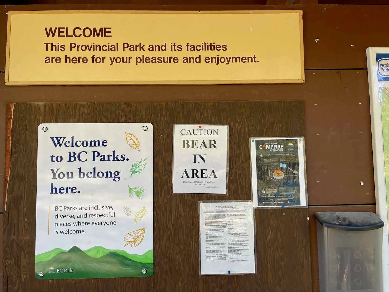 Signs in the campground informed us that there was a “Bear in Area.” It would have been nice if the campground had bear-proof boxes, but it didn’t. So we hung up our food several campsites away. Norbury Lake Provincial Park, British Columbia, Canada. Copyright © 2019-2022 Pedals and Puffins.