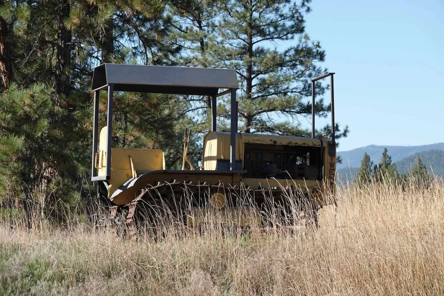 An antique tractor left resting in a field. Skookumchuck, British Columbia, Canada. Copyright © 2019-2022 Pedals and Puffins.