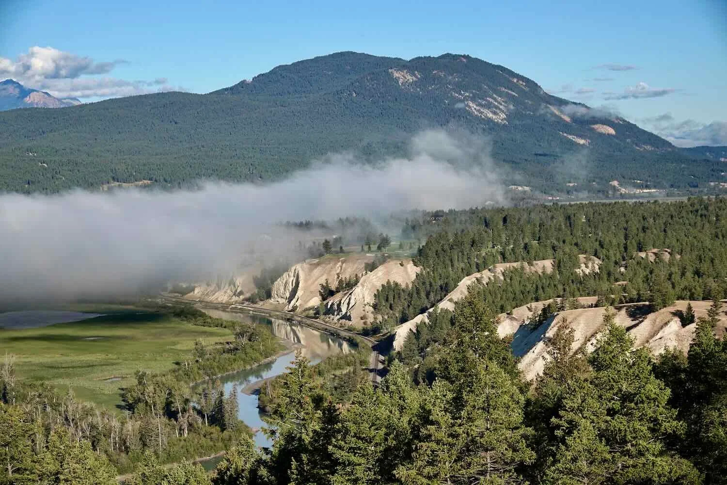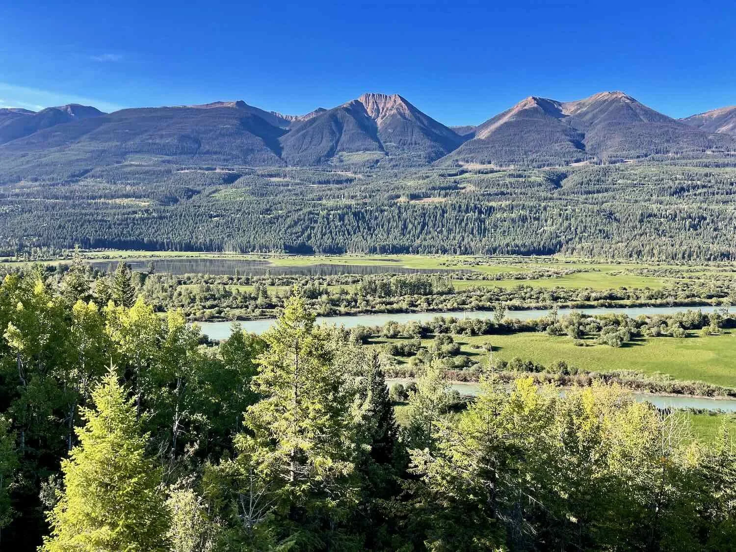 The headwaters of the Columbia River meander back and forth across scenic marshlands in the broad valley of the Rocky Mountain Trench. Columbia River Valley, British Columbia, Canada. Copyright © 2019-2022 Pedals and Puffins.