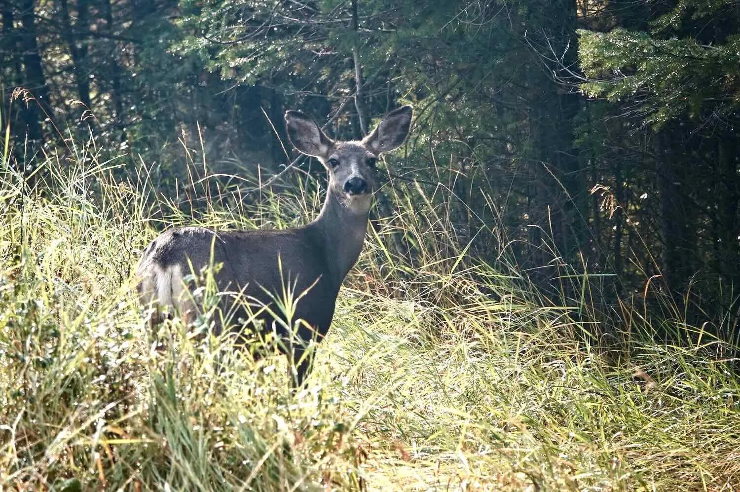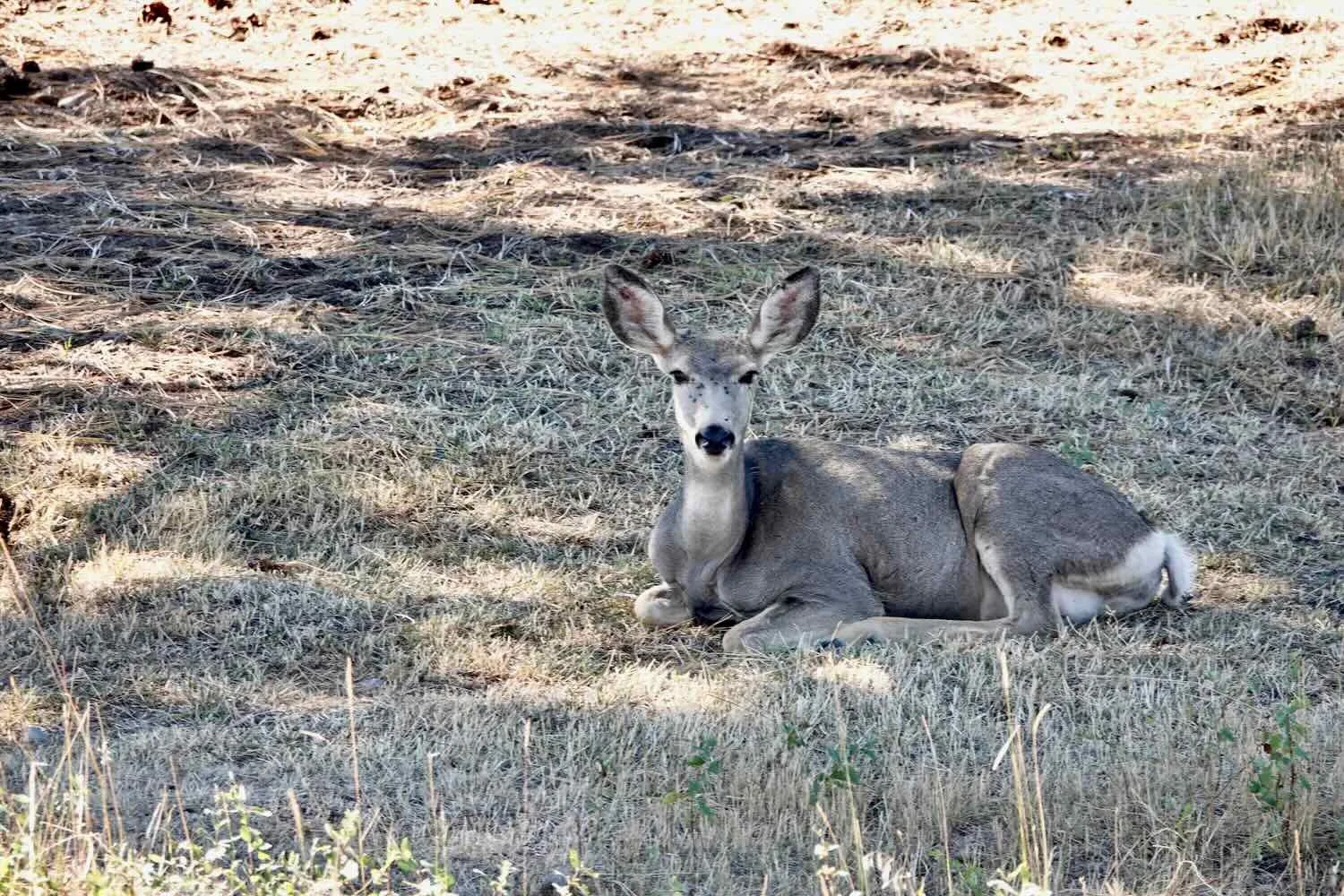 A mule deer doe rests in the shade. Wasa, British Columbia, Canada. Copyright © 2019-2022 Pedals and Puffins.