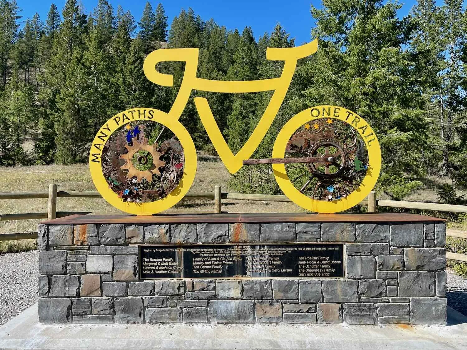 This artwork, called “The Last Spoke” commemorated the opening of the Westside Legacy Trail in 2020. It plays on the phrase “the last spike” that is associated with the completion of the TransCanada Railway. Fairmont Hot Springs, British Columbia, Canada. Copyright © 2019-2022 Pedals and Puffins.