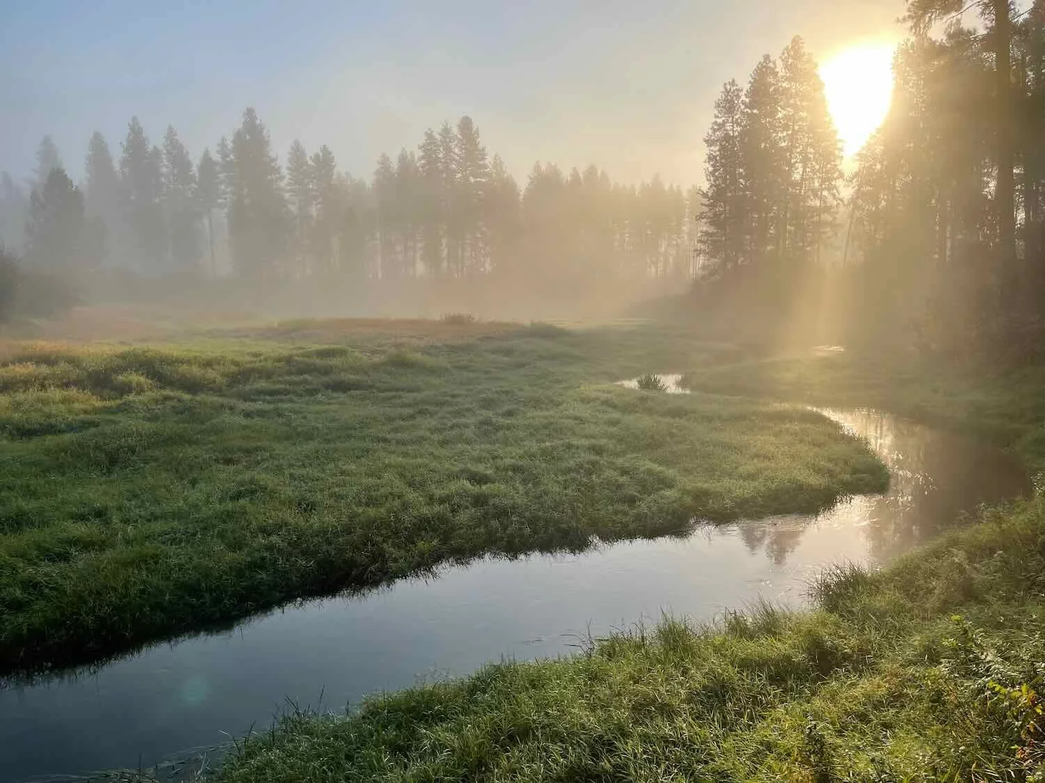 It was a very misty morning, and our tent was covered with dew. In fact, the mist was so thick that everything was wet. The dampness added to the harsh chill in the air. But it also gave the campground a lovely glow in the morning sun.