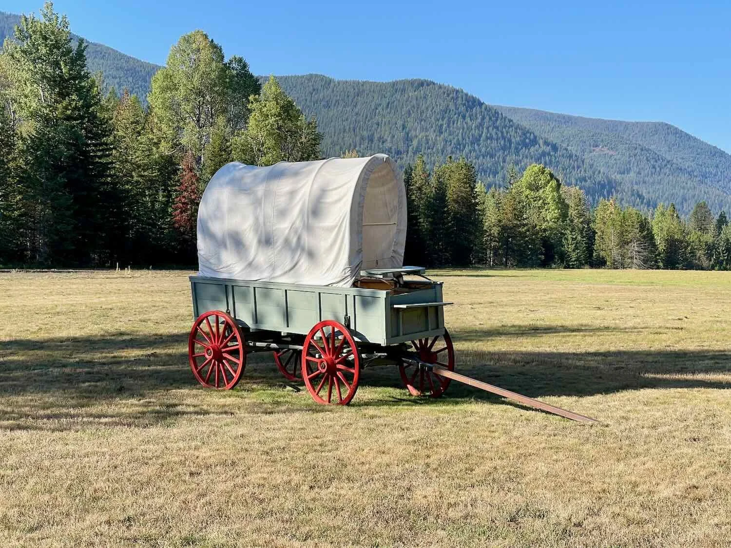 This restored covered wagon was on display near the entrance to a farm. Clark Fork River Valley, Montana, USA. Copyright © 2019-2022 Pedals and Puffins.