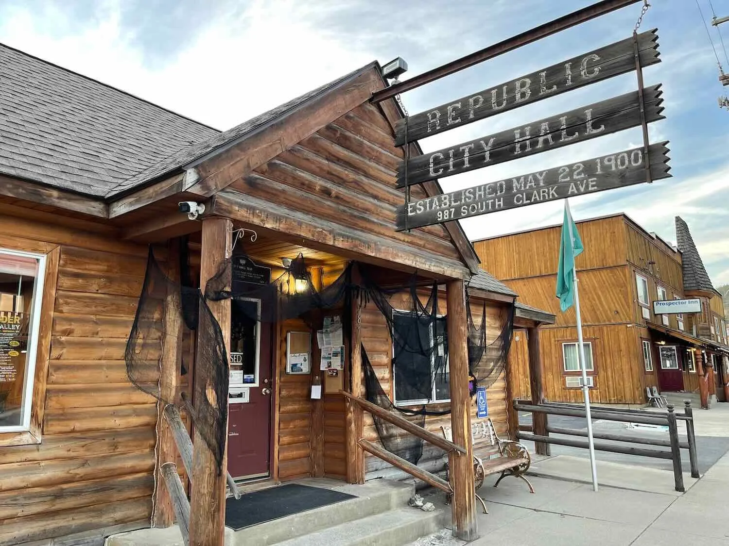 Republic’s City Hall is a log cabin built in 1933 by the Civilian Conservation Corps. Republic, Washington, USA. Copyright © 2019-2022 Pedals and Puffins.