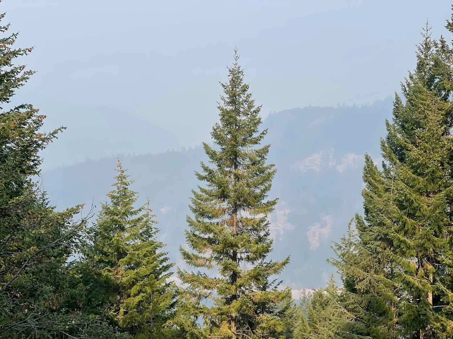 We couldn’t enjoy the mountain scenery on our descent from Rainy Pass because smoke obscured our view. North Cascades National Park, Washington, USA. Copyright © 2019-2022 Pedals and Puffins.