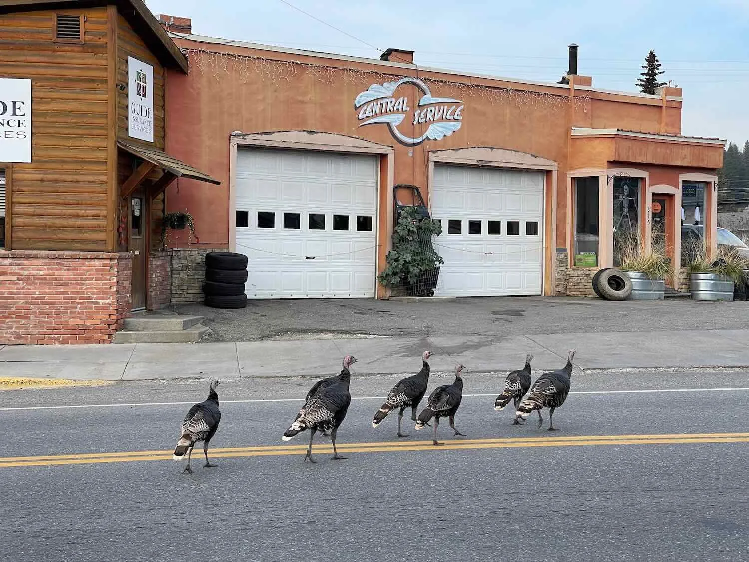 This flock of wild turkeys wandered through town. Republic, Washington, USA. Copyright © 2019-2022 Pedals and Puffins.