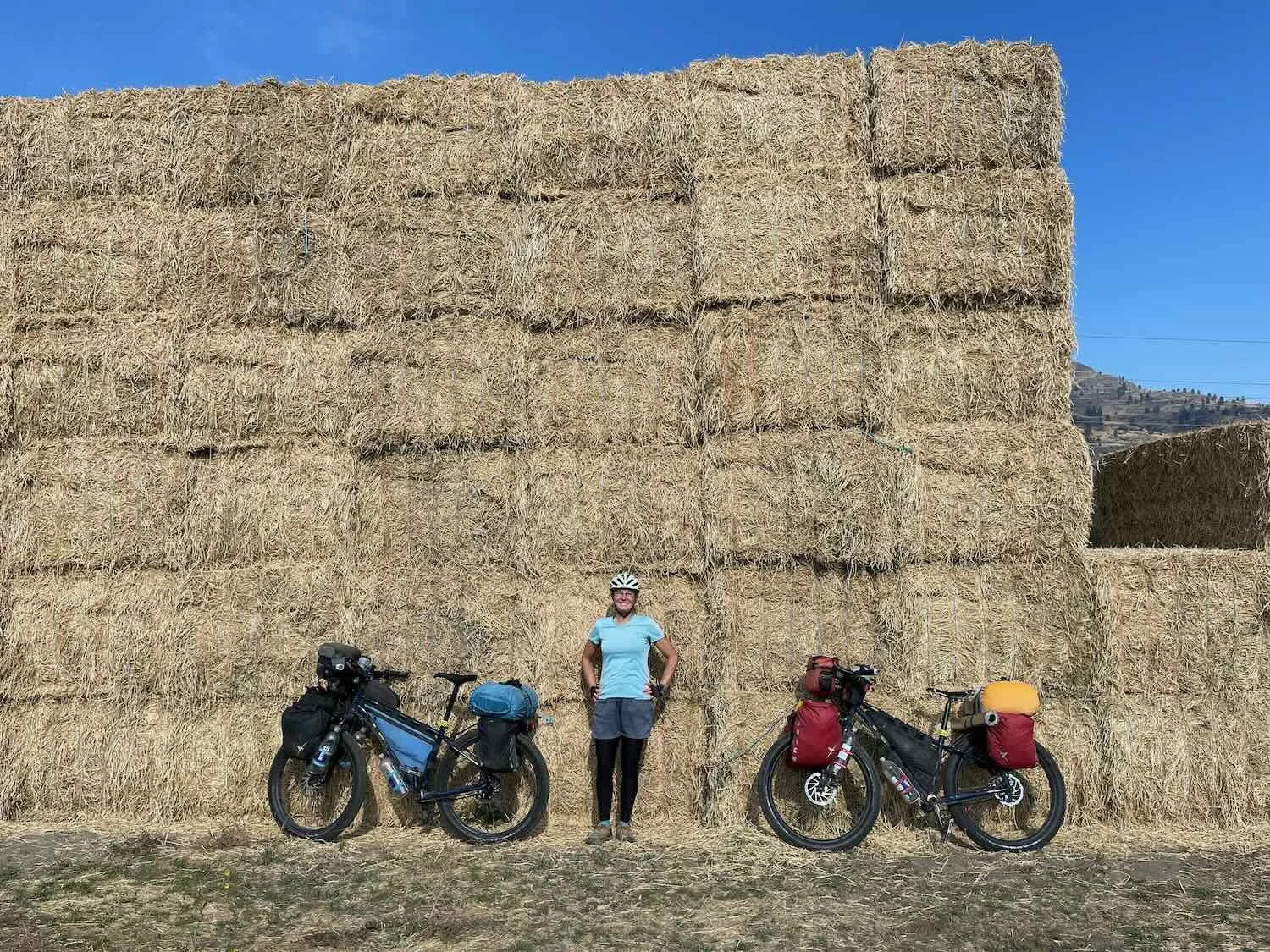 Taking shelter behind a wall of hay. Okanogan Highlands, Washington, USA. Copyright © 2019-2022 Pedals and Puffins.