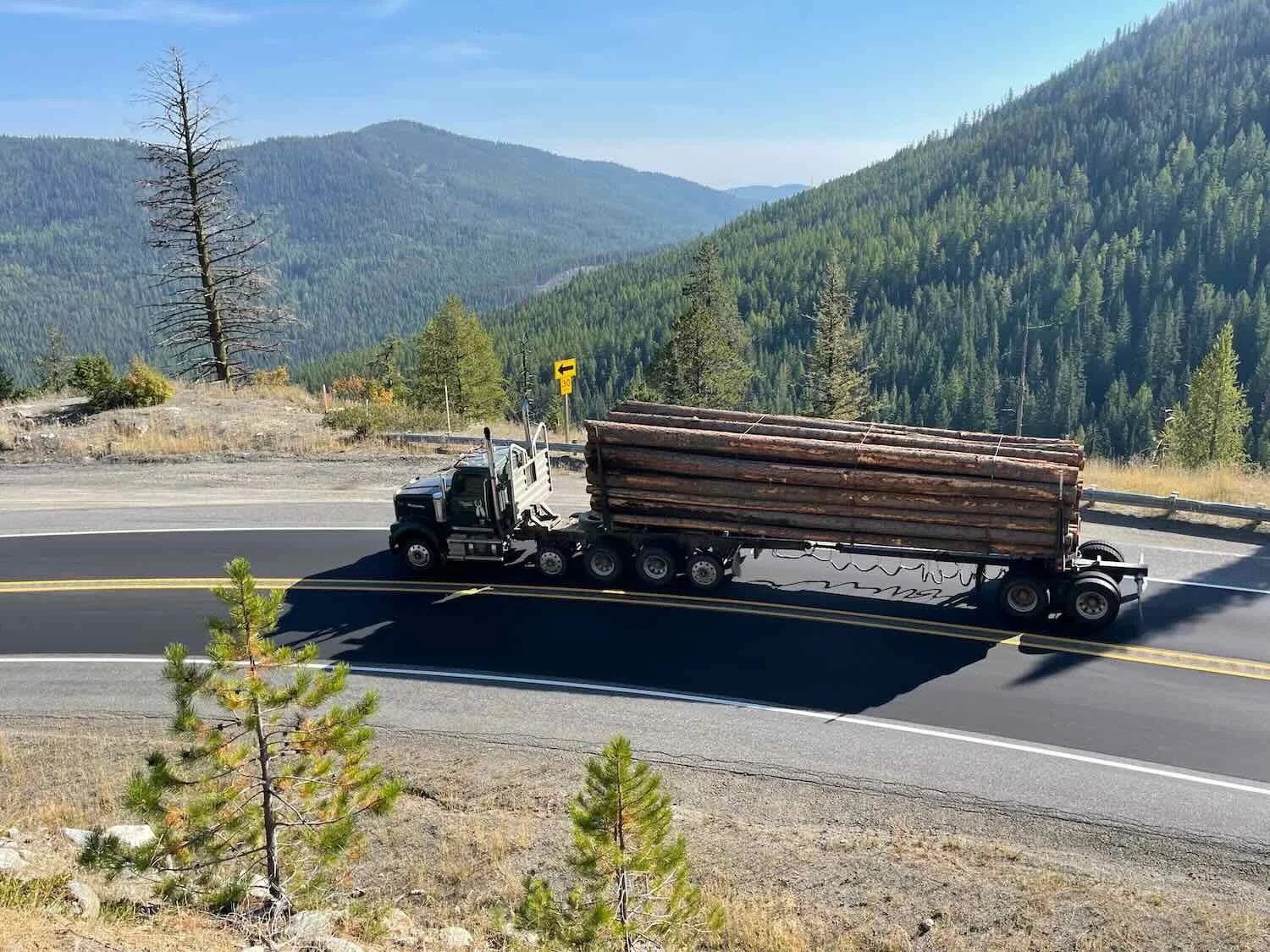 A logging truck passes on the road below us at the Sherman Canyon overlook. Near Sherman Pass, Washington, USA. Copyright © 2019-2022 Pedals and Puffins.