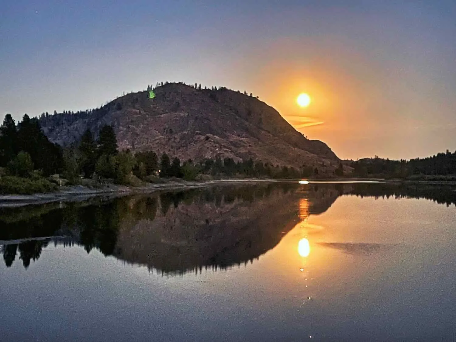 The flame-orange glow of the full moon reflected in the water of Leader Lake, Washington, USA. Copyright © 2019-2022 Pedals and Puffins.