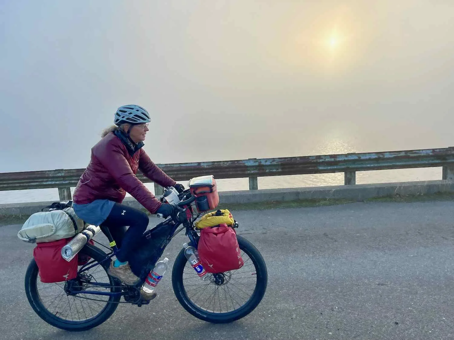 Cycling across the Long Bridge, a 2-mile long span across Lake Pend Oreille, in the morning mist. The fog was so heavy we couldn’t see the shoreline, and the lake seemed to go on forever. Idaho, USA. Copyright © 2019-2022 Pedals and Puffins.