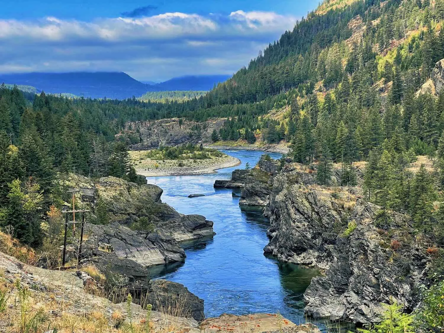 As the gray clouds of the morning lifted, the Kootenai River turned a dazzling, azure blue in the sunlight. Kootenai River Park, Montana, USA. Copyright © 2019-2022 Pedals and Puffins.