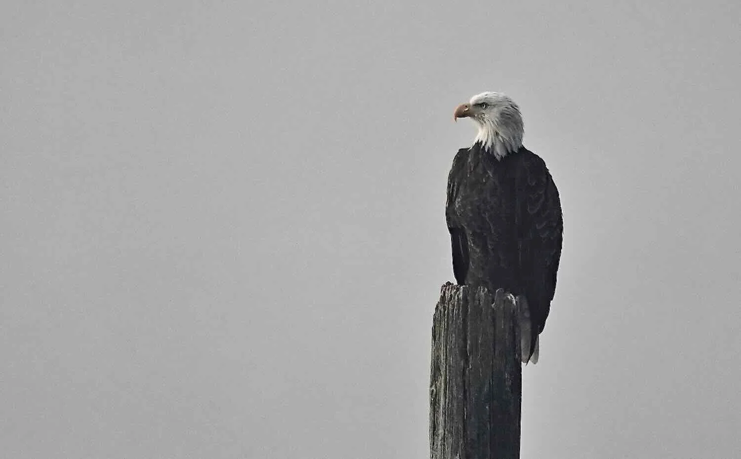 This bald eagle seems to instinctively know how regal it looks, perched on a wooden piling in the Pend Oreille River, Washington, USA. Copyright © 2019-2022 Pedals and Puffins.