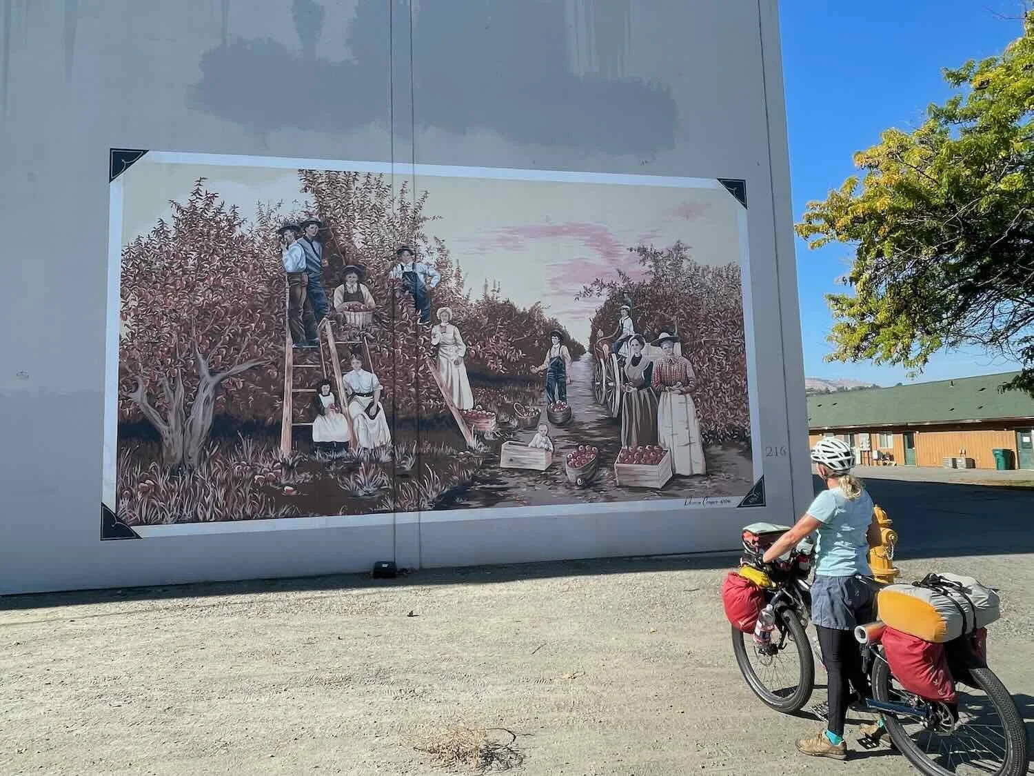 A mural depicted a family of apple farmers, reflecting the region’s agricultural heritage. Okanogan, Washington, USA. Copyright © 2019-2022 Pedals and Puffins.