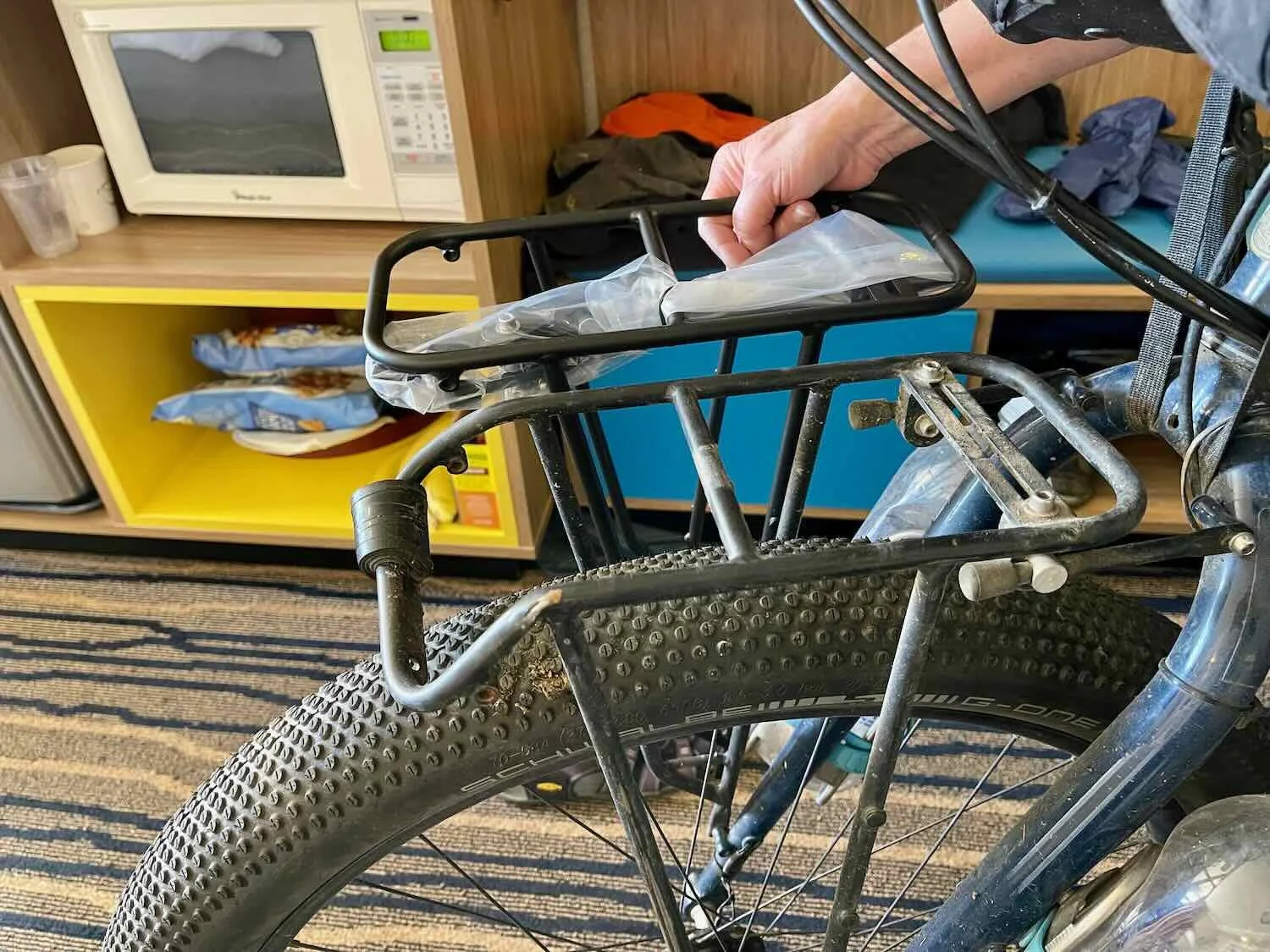 When PedalingGuy accidentally got one of his luggage straps wrapped around the front axel on his bike while riding, the incredible force of the strap being pulled into the wheel bent his steel front rack down towards the tire. Here you can see the bent rack compared to a straight, new one (which we purchased later). Copyright © 2019-2022 Pedals and Puffins.