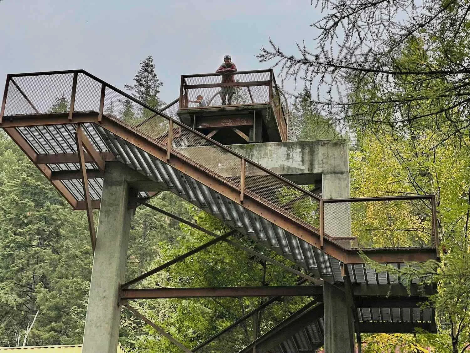 Waiting with the bikes at the top of the stairs. Kootenai Falls Park, Montana, USA. Copyright © 2019-2022 Pedals and Puffins.