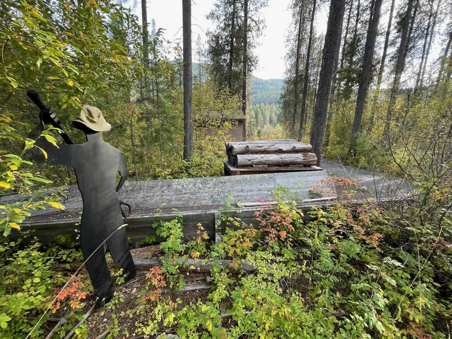 A shadowy statue of a logger evokes the spirit of the men who once sent huge logs down the mountain via wooden log flumes. Log Flume Heritage Site, Washington, USA. Copyright © 2019-2022 Pedals and Puffins.