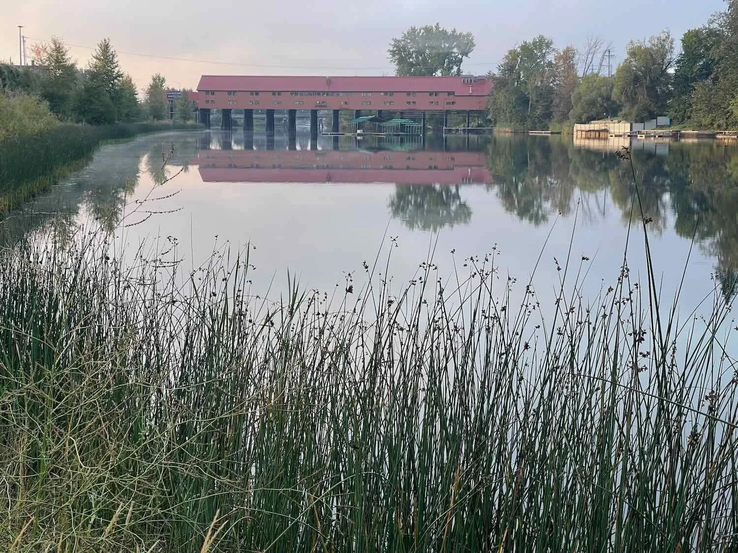 The Cedar Street Bridge Market’s red roof reflected in the still waters of Sand Creek as we cycled by. Sandpoint, Idaho, USA. Copyright © 2019-2022 Pedals and Puffins.