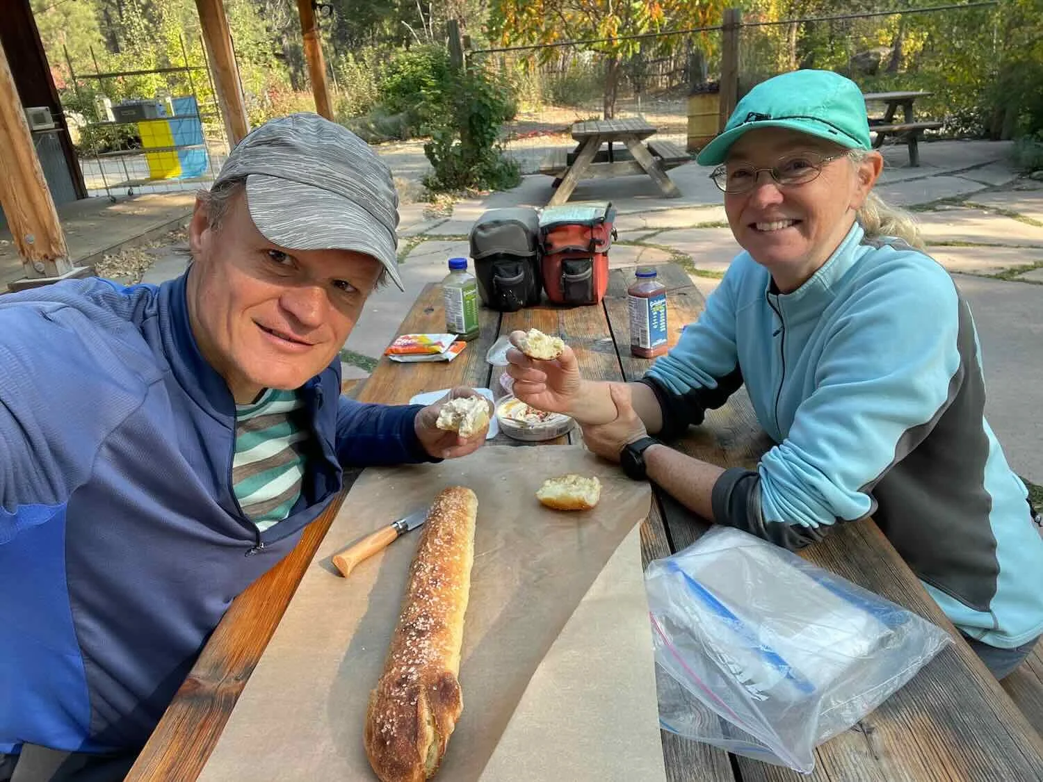 Savoring a sea salt baguette with hummus at the Mazama Store. Washington, USA. Copyright © 2019-2022 Pedals and Puffins.