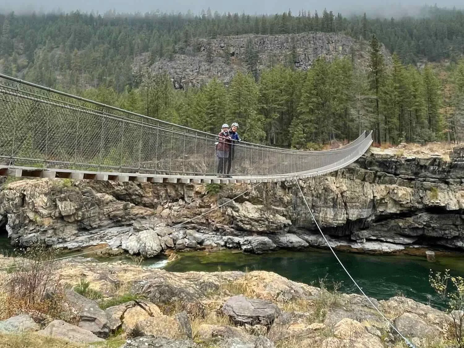 Soaking up the view of the Kootenai River as it rushes through a canyon below the swinging bridge. Kootenai Falls Park, Montana, USA. Copyright © 2019-2022 Pedals and Puffins.