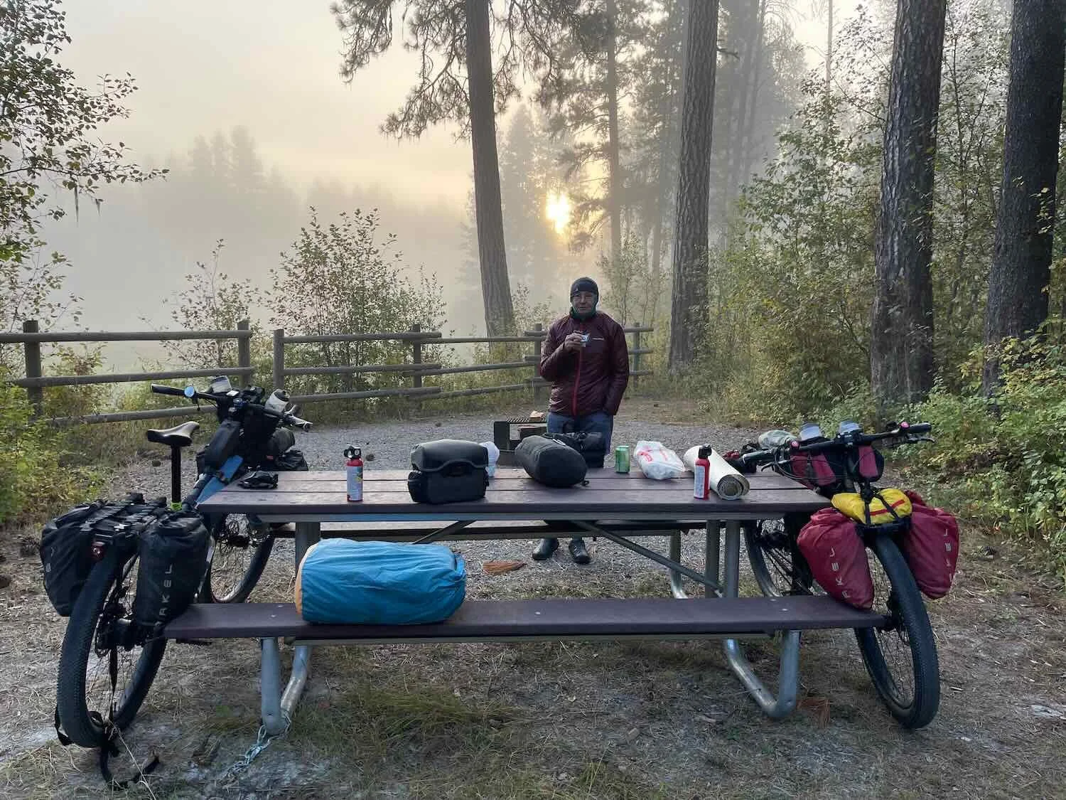 Packing up in the morning mist. Skookum Creek Campground, Washington, USA. Copyright © 2019-2022 Pedals and Puffins.