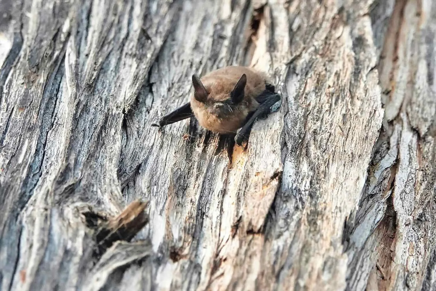 As we were resting on some rocks near a dock, we were surprised to see a small bat flutter slowly by, not far above our heads. It was moving pretty slowly, not darting swiftly around like most bats we’ve seen. We watched as it landed about 25 ft up (7.5 m), on the side of a nearby tree, then headed over to have a closer look.