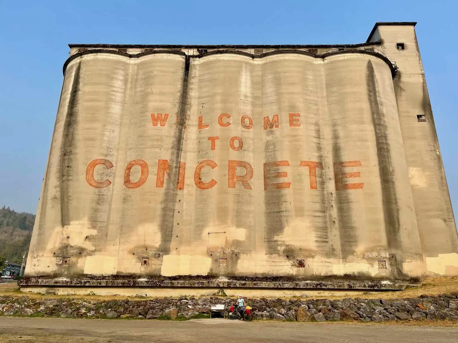 That tiny figure is PedalingGal at the base of huge cement silos. Concrete, Washington, USA. Copyright © 2019-2022 Pedals and Puffins.