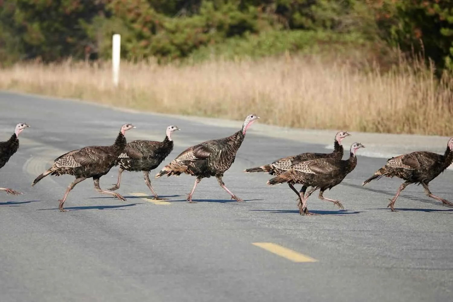 A flock of wild turkeys darts across the road. Pend Oreille River Valley, Idaho, USA. Copyright © 2019-2022 Pedals and Puffins.