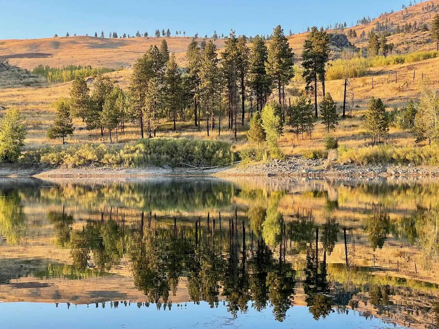 Fall colors reflected in the still waters of Leader Lake. Washington, USA. Copyright © 2019-2022 Pedals and Puffins.