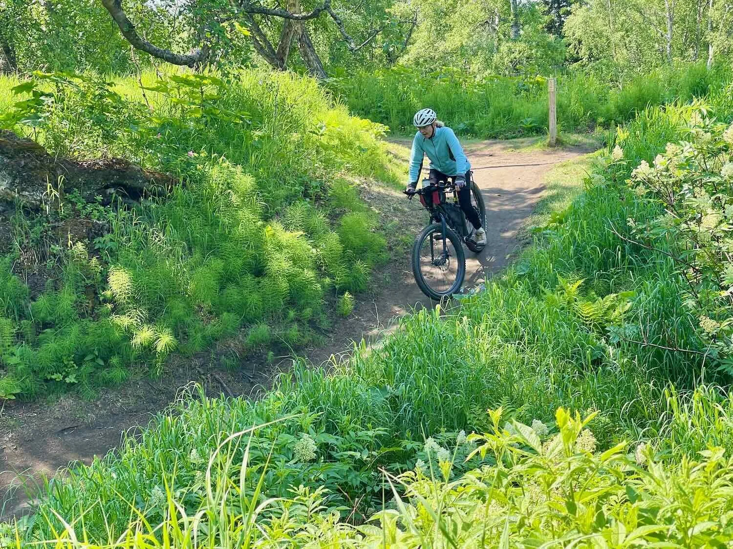 Going with the flow on one of the many mountain bike trails in Far North Bicentennial Park. Anchorage, Alaska, USA. Copyright © 2019-2022 Pedals and Puffins.