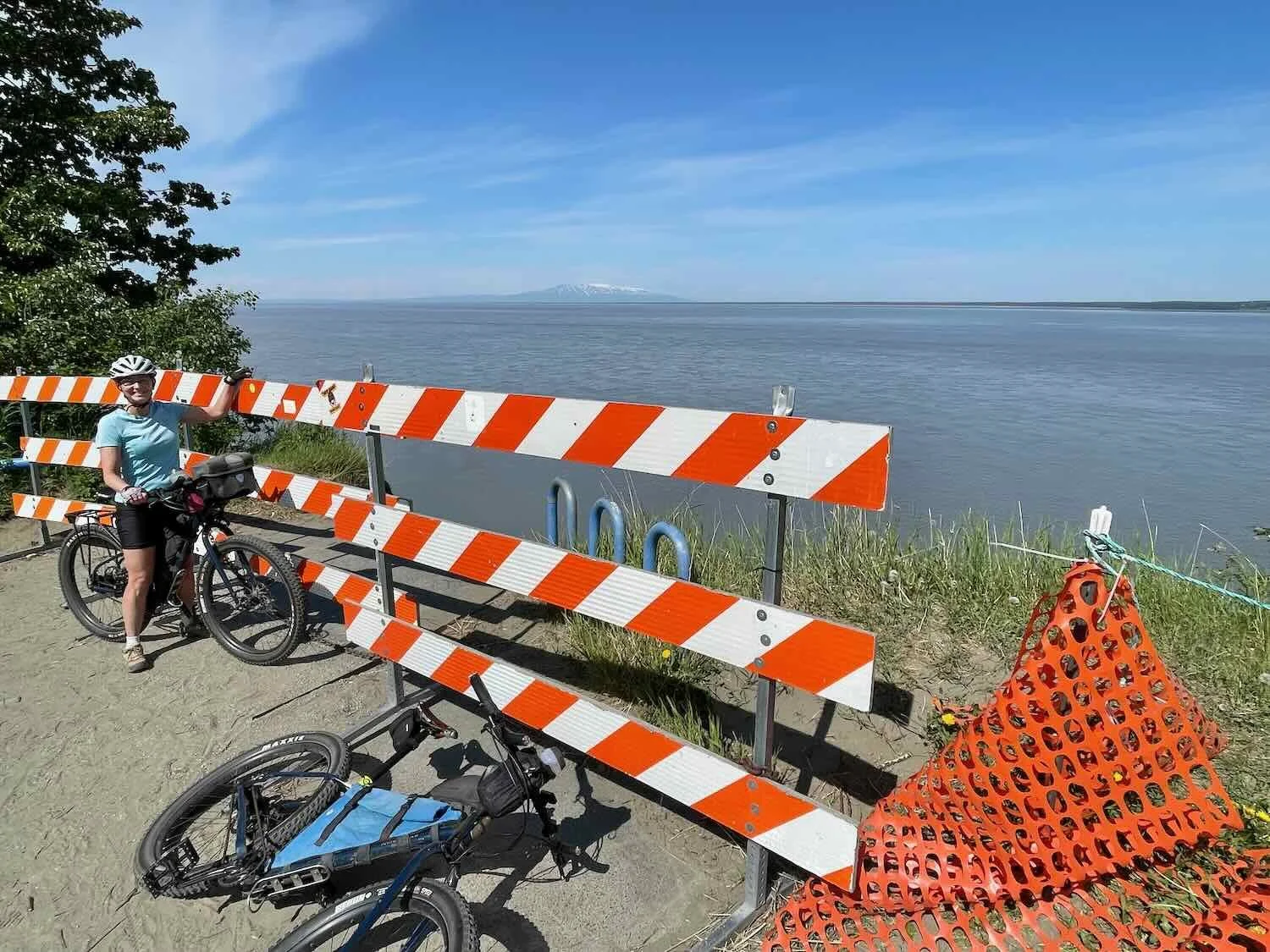 Watch your speed when descending off the bluff at Point Woronzof. A couple of temporary metal barriers are all that will keep you from flying over the edge of this cliff. Alaska, USA. Copyright © 2019-2022 Pedals and Puffins.