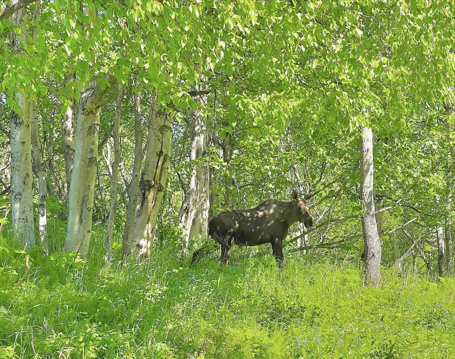 A sun-dappled moose strolls through the birch trees on a hillside in Kincaid Park. Alaska, USA. Copyright © 2019-2022 Pedals and Puffins.