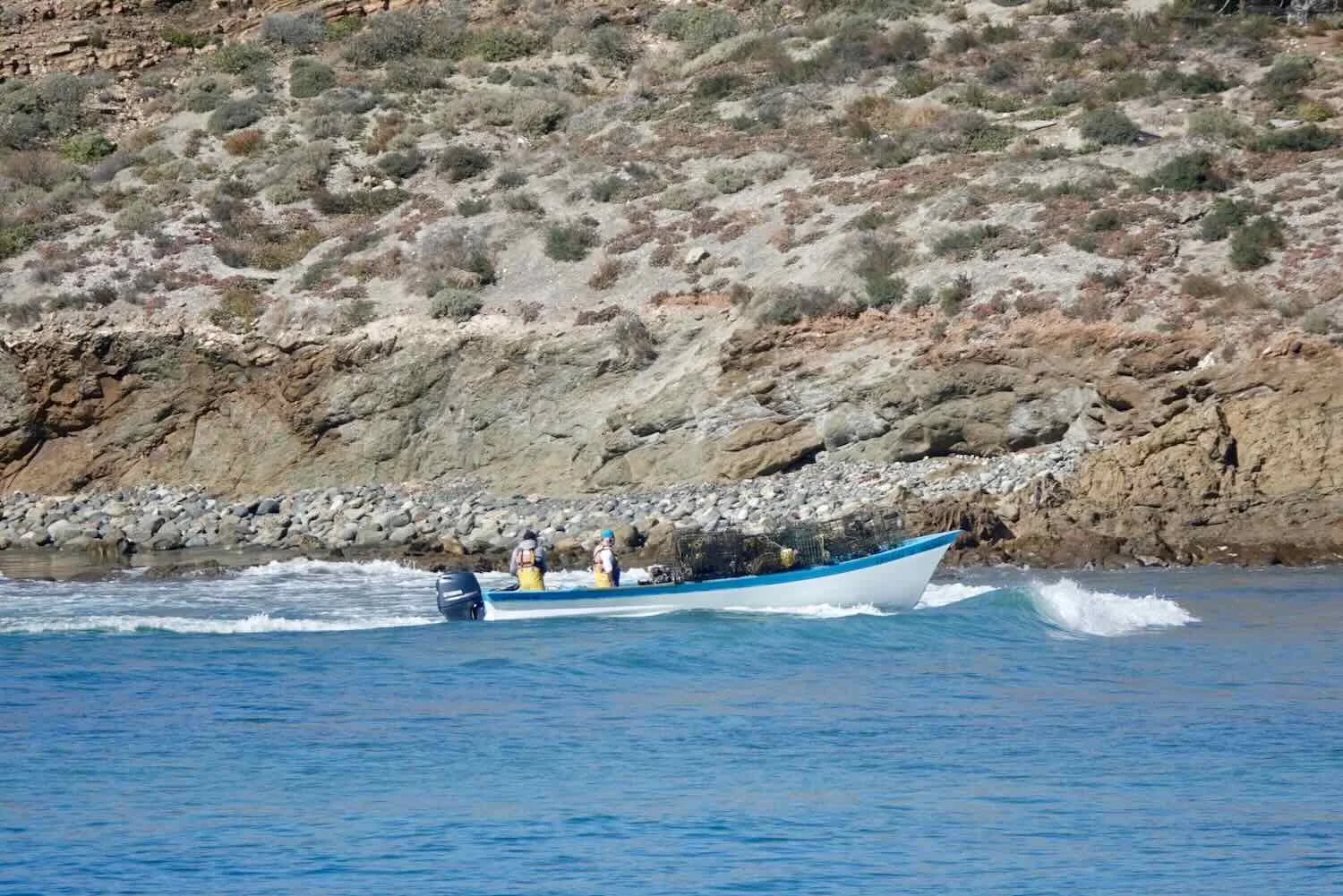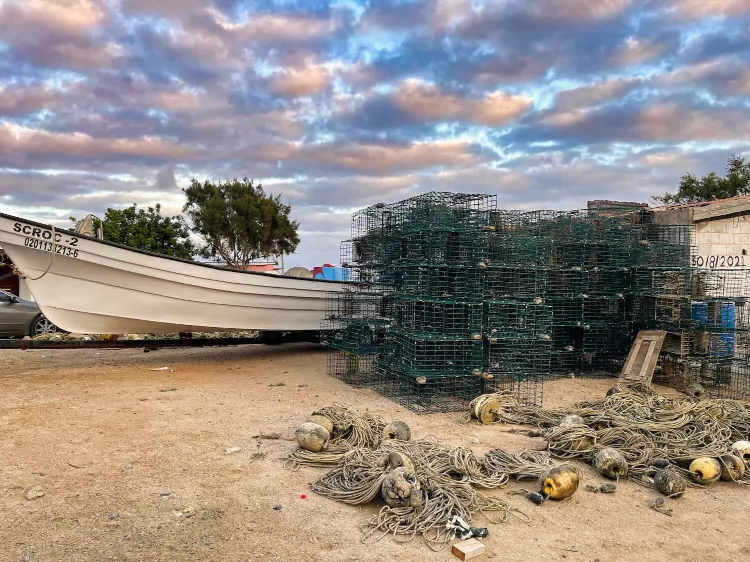 A panga boat and lobster traps along the waterfront, in the evening light. Santa Rosaliíta, Baja California, Mexico. Copyright © 2019-2023 Pedals and Puffins.