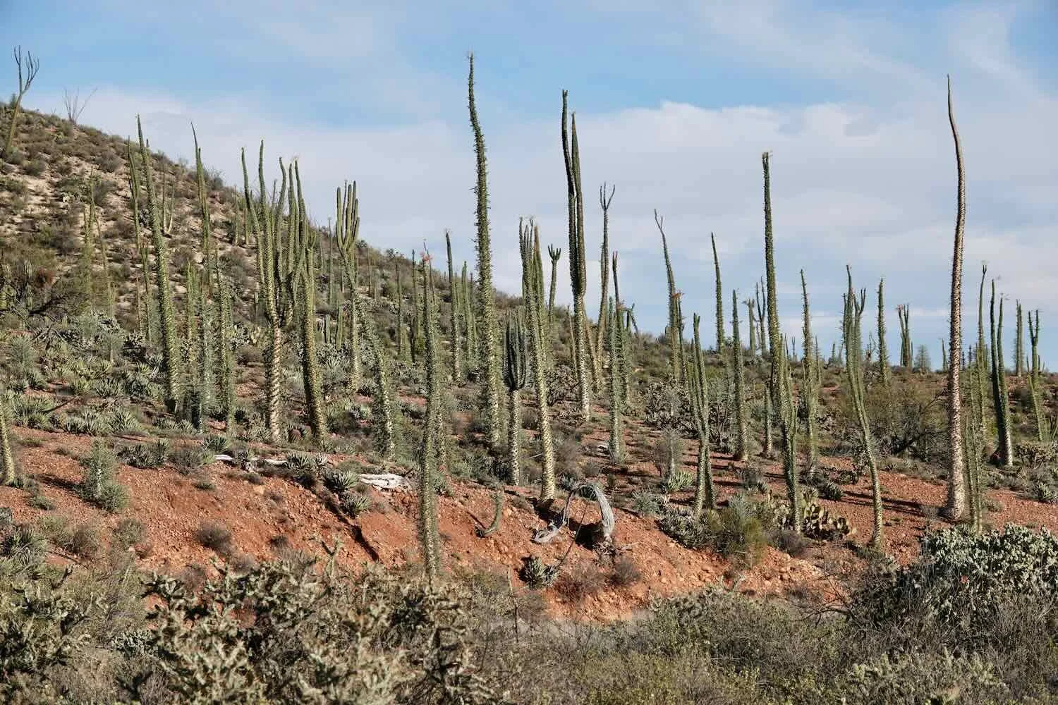 As we climbed our way slowly up the hills, the diversity of cacti quickly multiplied. The first oddity was a hillside full of the long, wavy arms of something called the galloping cactus (endemic to Baja). The name certainly fits the plant. It’s jumble of long, curvy stems - each one as thick as your arm - seem to be in a hurry to spread chaotically over everything in their path. A hillside covered with galloping cactus almost seethes with a sense of movement, looking like a garden of Medusa’s hair, covered in lethal spines.