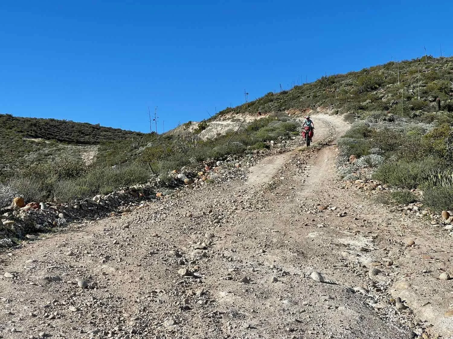 Fred ended up having to walk his bike for 12.5 miles (20 km) back down the mountain to the highway, and hitching rides north to the town of Vicente Guerrero (25 miles) where he could get his bike repaired. He was lucky that one of the few, and arguably the best, bike repair shops in all of Baja is located there. It was a relatively short distance away, compared to what it might have been after a few more days of riding. Still, we felt bad for him. Fortunately, he assured us before we left that he had plenty of food and water to make the trip. That’s the most important insurance you can have when traveling in remote areas. We said goodbye, and wished him luck. (Note: we later heard that he made it back in one piece, and that it was the tire bead that was damaged, rather than the wheel. He was able to replace the tire, and was back on the trail in just a few days).