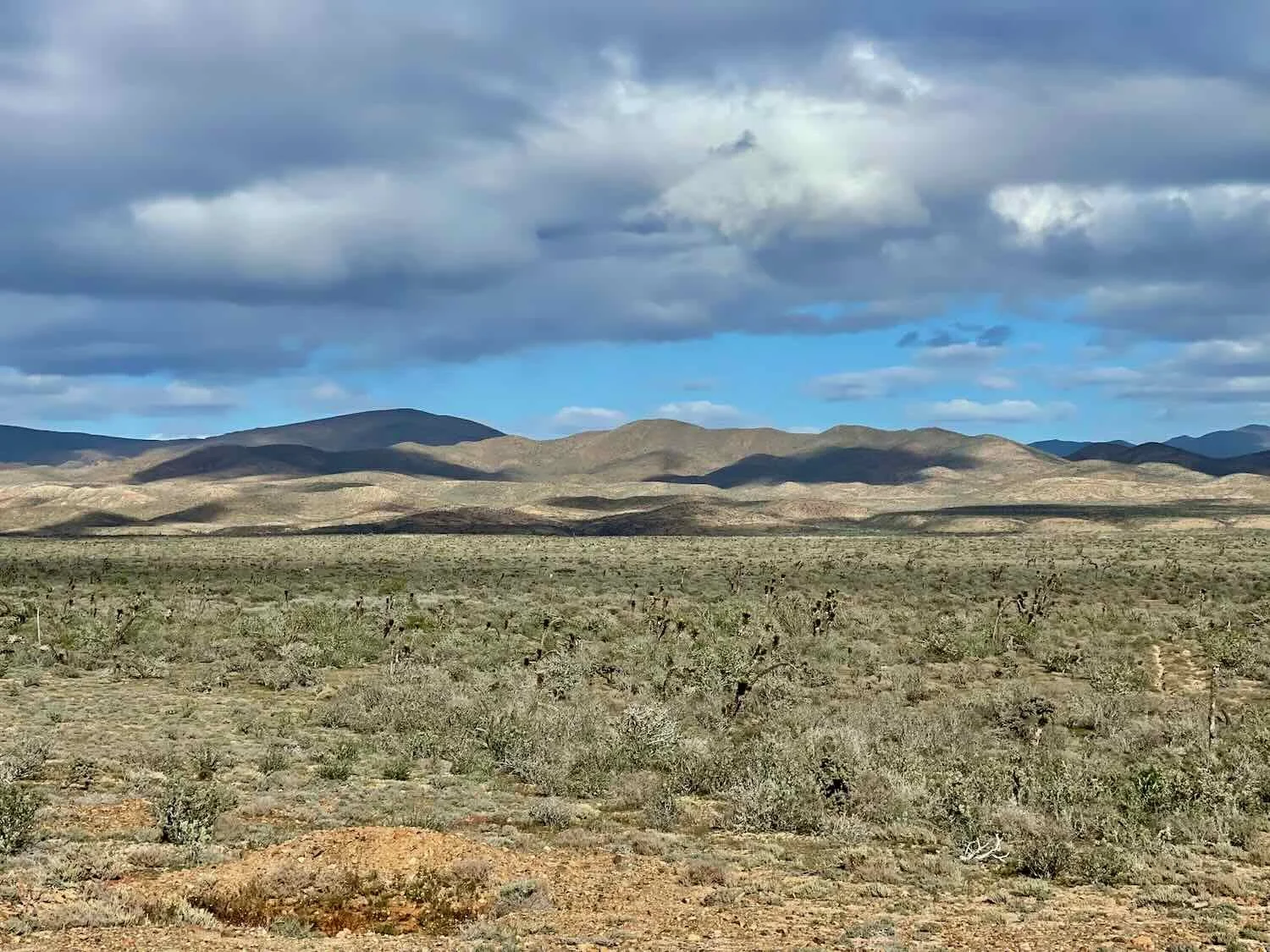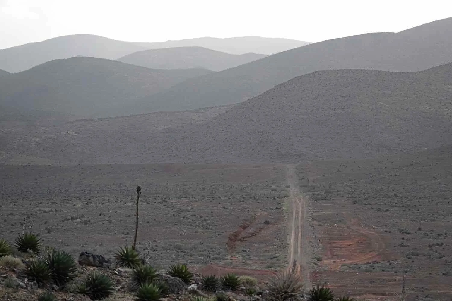Our route heads across a lowland, toward the gray shadows of hills ahead. Punta Lobos, Baja California, Mexico. Copyright © 2019-2023 Pedals and Puffins.