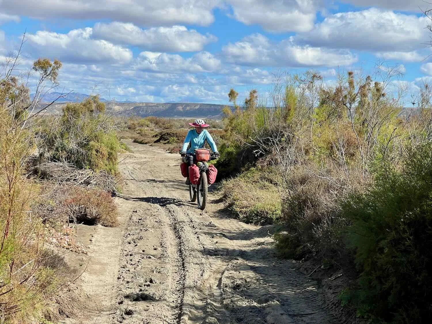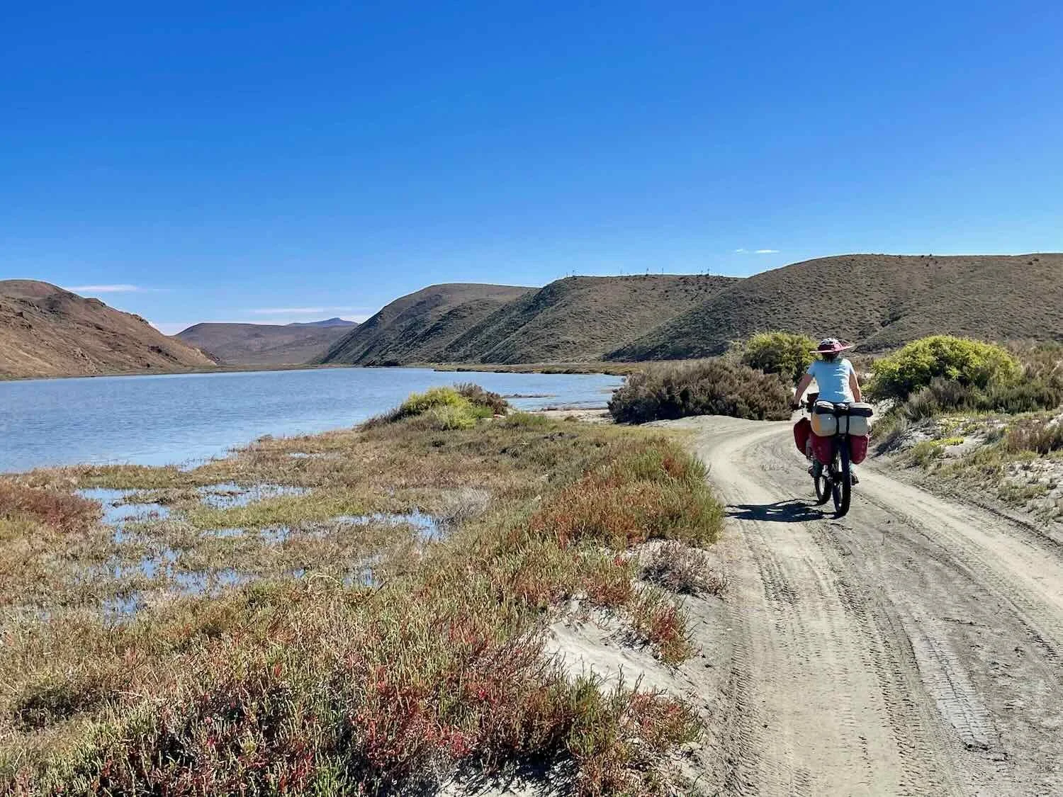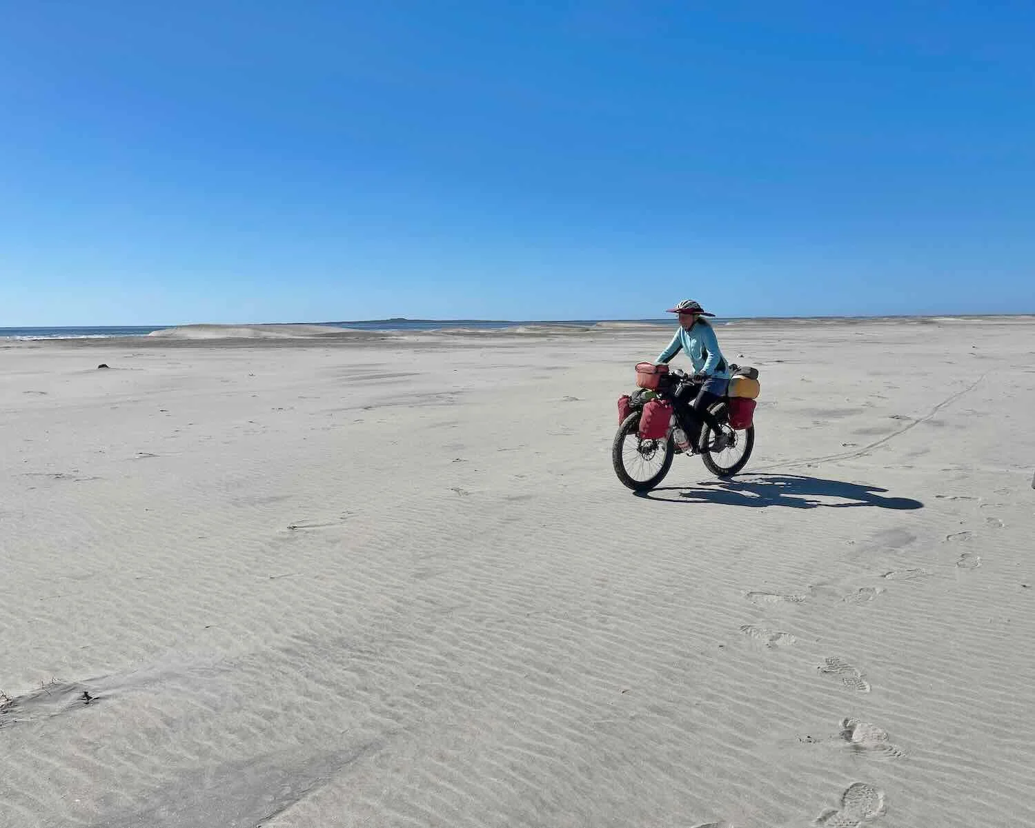 Cycling through the sand. Bahía San Quintín, Baja California, Mexico. Copyright © 2019-2023 Pedals and Puffins.