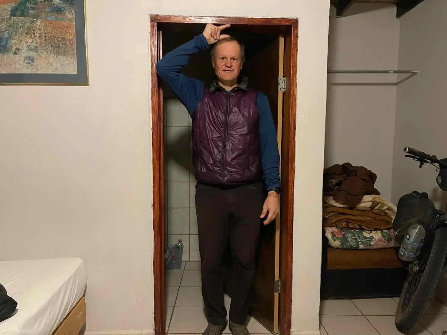 The hotel room was designed for smaller people. PedalingGuy barely fit through the door of the bathroom. Ejido Nuevo Rosarito, Baja California, Mexico. Copyright © 2019-2023 Pedals and Puffins.