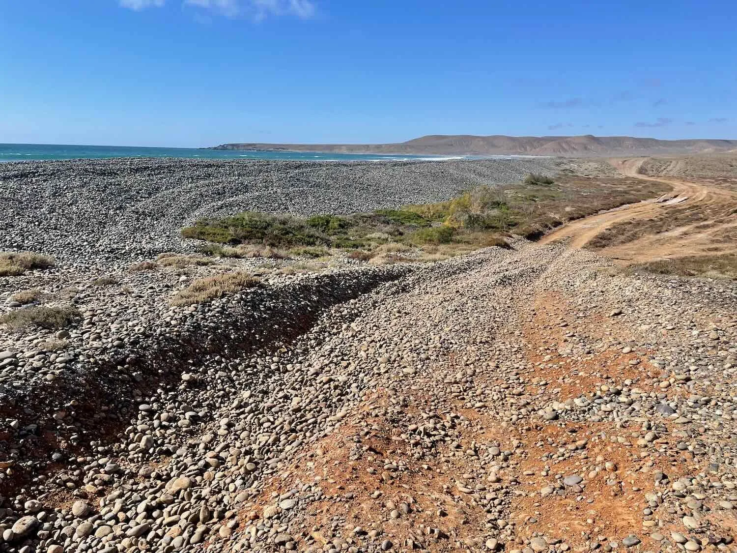 A high berm of cobblestones separated our road from the beach. Lots of the cobbles littered the road surface, making for some squishy riding. South of San José del Faro, Baja California, Mexico. Copyright © 2019-2023 Pedals and Puffins.