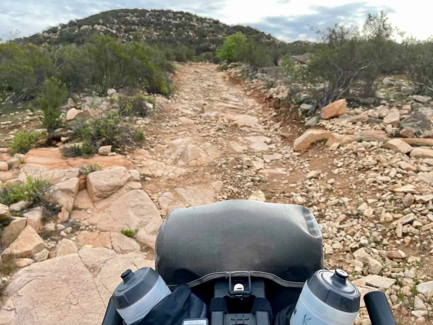 A steep, rocky ascent, as seen from PedalingGuy’s cockpit. Cerro de San Miguel, Baja California, Mexico. Copyright © 2019-2023 Pedals and Puffins.