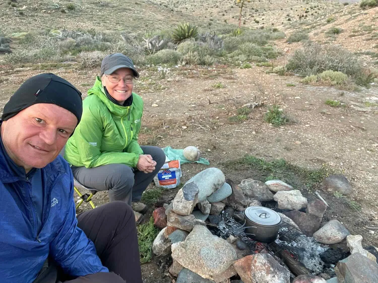 Cooking dinner over the open fire. Punta Lobos, Baja California, Mexico. Copyright © 2019-2023 Pedals and Puffins.