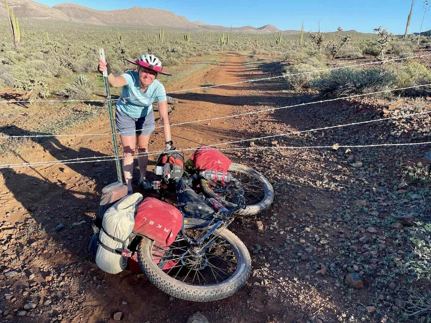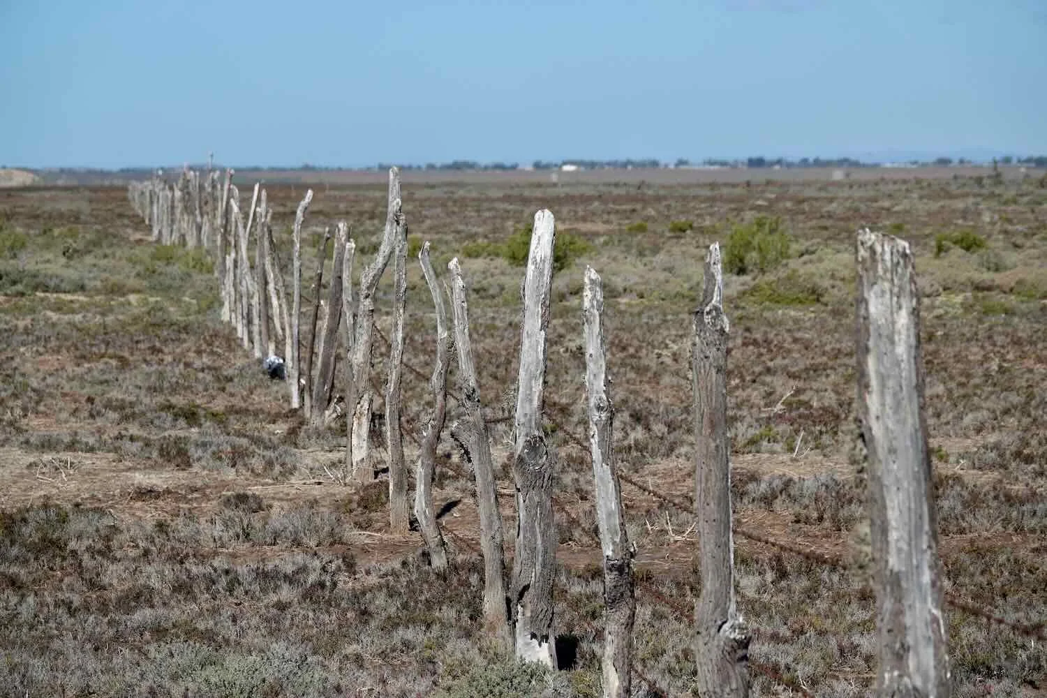 Rough-hewn, barbed wire fences often lined the edge of the road. Bahía San Quintín, Baja California, Mexico. Copyright © 2019-2023 Pedals and Puffins.