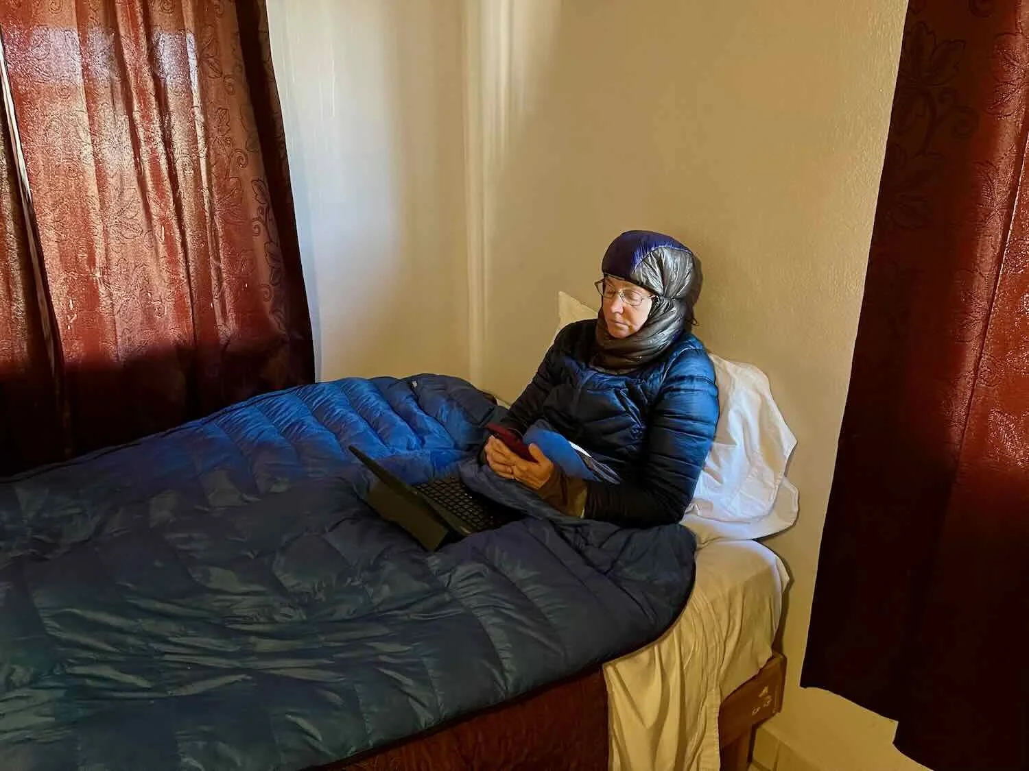 Trying to stay warm in our hotel room. There was no heater, and big gaps around the door let in cold air. Ejido Nuevo Rosarito, Baja California, Mexico. Copyright © 2019-2023 Pedals and Puffins.