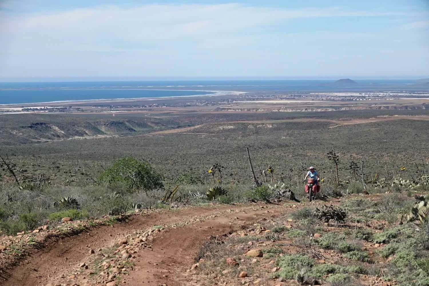 Pushing up another hill, with the beautiful Pacific Ocean in the background. South of San José del Faro. Baja California, Mexico. Copyright © 2019-2023 Pedals and Puffins.
