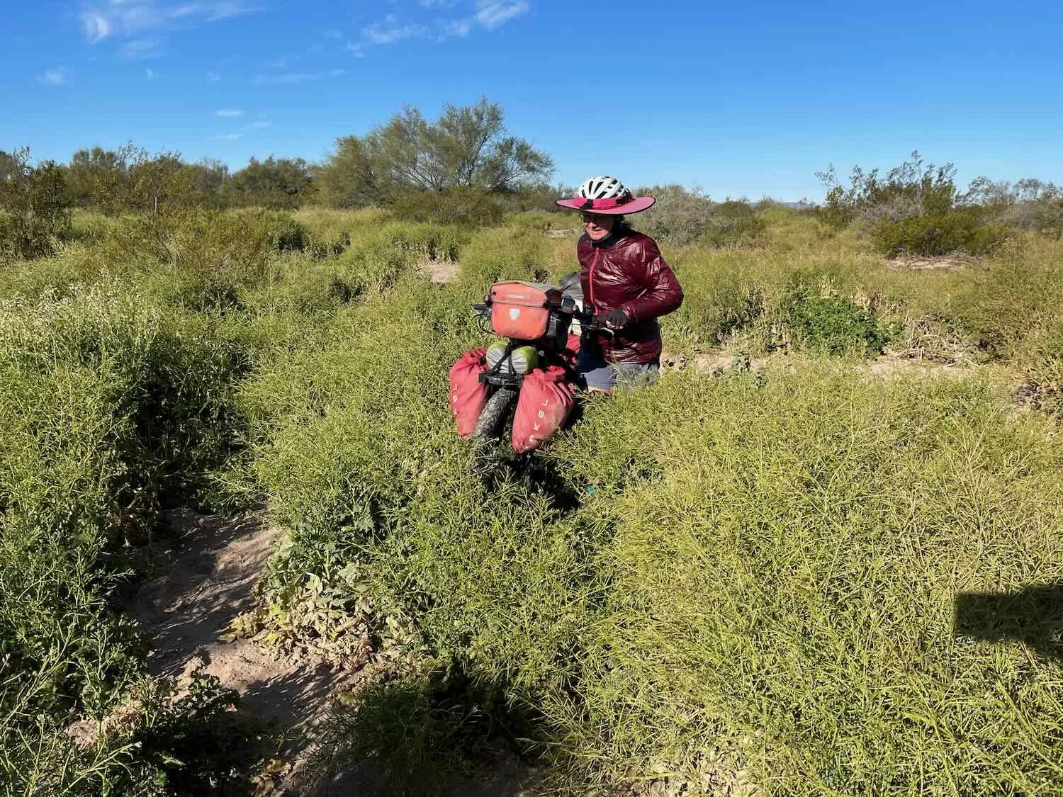 Trudging over sand dunes, trying to find a path around the lagoon. Bahía Blanco, Baja California, Mexico. Copyright © 2019-2023 Pedals and Puffins.