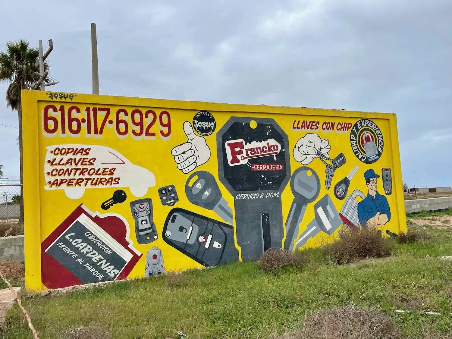 Billboards along Highway 1 promote local businesses with bright colors and lively images evoking the products and services for sale. Santa Fe, Baja California, Mexico. Copyright © 2019-2023 Pedals and Puffins.