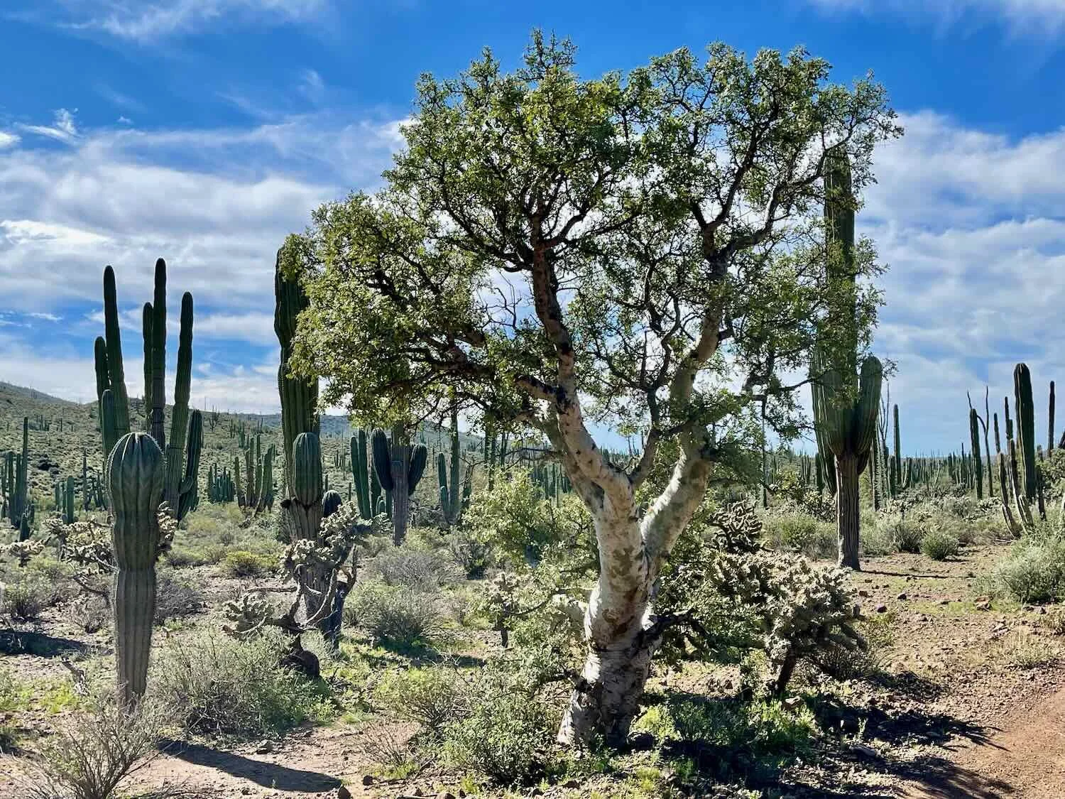 This was one of the biggest cardón cactus trees (a.k.a., elephant cactus) that we saw. It must have been over 50 ft (15 m) tall. (Note the small figure of PedalingGal standing to the left of its trunk.) Valle de los Cirios, Baja California, Mexico. Copyright © 2019-2023 Pedals and Puffins.