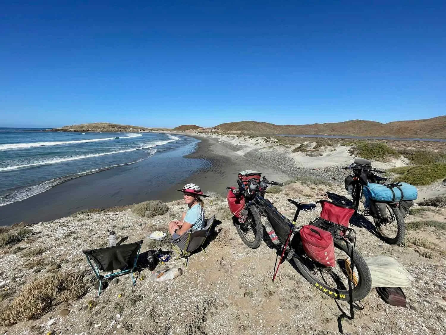 Cycling along the sand on the beach. This was a whole lot easier than pushing our bikes through soft sand dunes. Bahía Blanco, Baja California, Mexico. Copyright © 2019-2023 Pedals and Puffins.